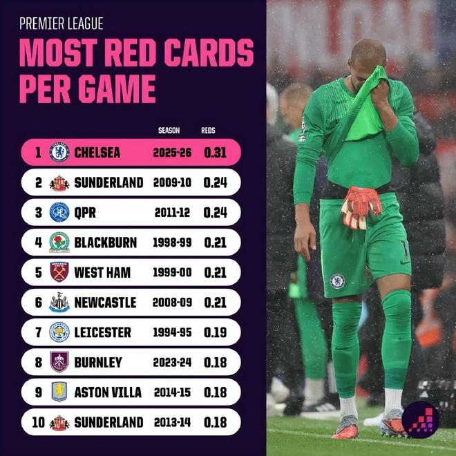在贏下世俱杯冠軍之后,切爾西的新賽季被很多人寄予厚望,沒想到他們卻跌入了“紅牌陷阱”。他們愛英超前13輪拿到了4張紅牌(場(chǎng)均0.31張),這個(gè)效率如果保持下去,甚至可以創(chuàng)造英超新紀(jì)錄。