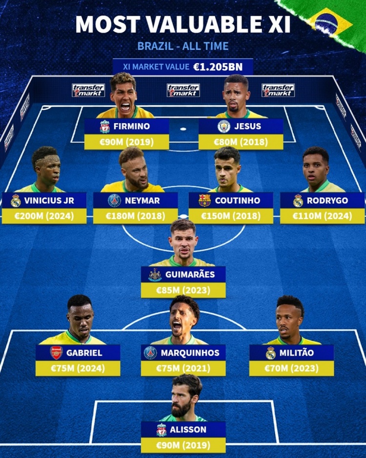 德轉(zhuǎn)列巴西歷史身價最高陣容